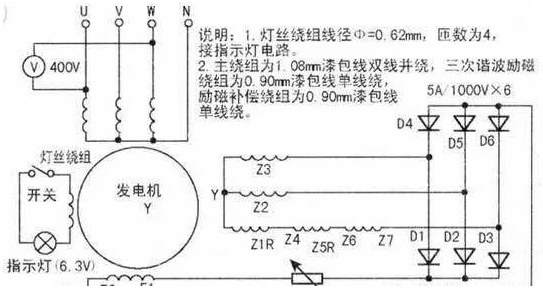 柴油發(fā)電機(jī)組實(shí)質(zhì)是臺三次諧波自勵磁凸式三相四線同步發(fā)電機(jī),因具有輸出功率大、適合移動等優(yōu)點(diǎn),故廣泛用于廠礦、工程施工等場合。雖然功率不同的發(fā)電機(jī),其繞組數(shù)據(jù)有所不同,但電路連接基本相同。